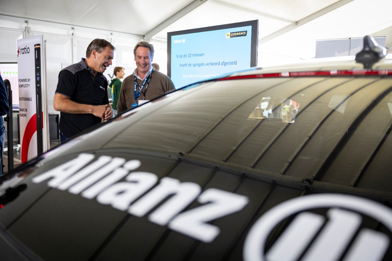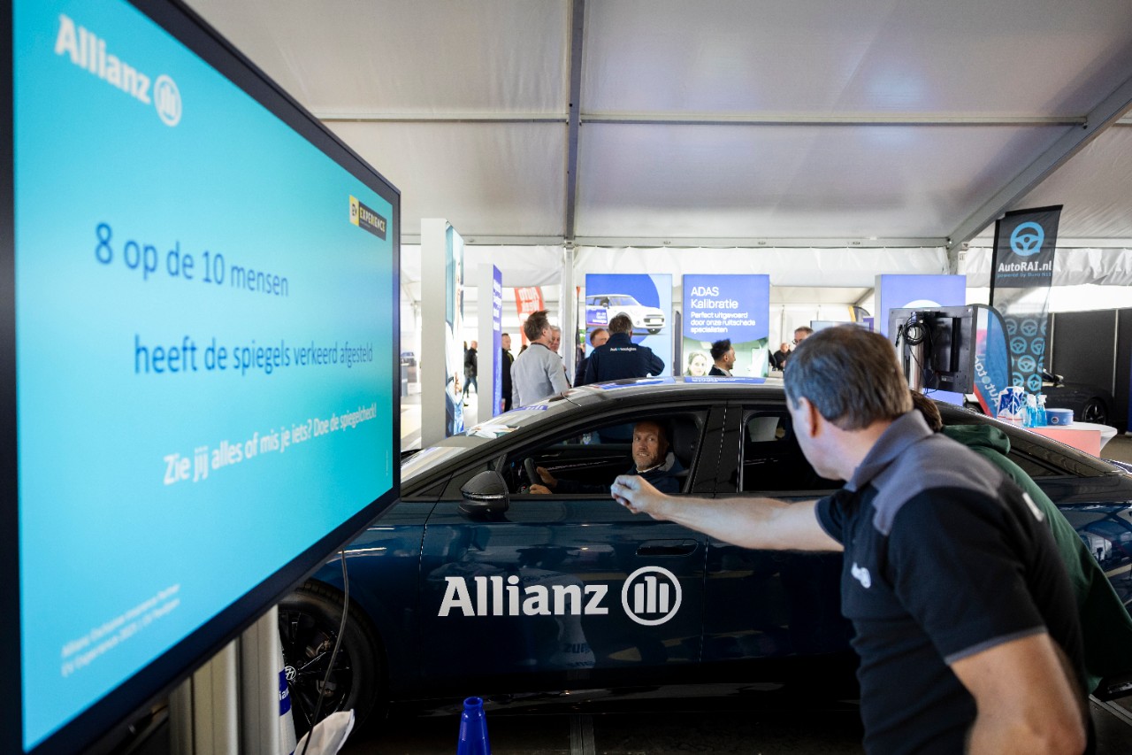 In het overdekte EV Paviljoen heeft Allianz een grote stand. Hier staan fleet riskmanagers Tim Swanborn, Tom Velthuis en René Brand met spiegelafstelling-demo. De belangstelling onder bezoekers is groot. “Bij acht van de tien automobilisten staan de spiegels verkeerd afgesteld”, vertelt Swanborn. “Wij willen ze bewust maken van het belang van een goede spiegelafstelling en een juiste rijhouding. Het is perfect voor dit evenement: kort en krachtig, maar met een groot effect. Mensen schrikken ervan.”